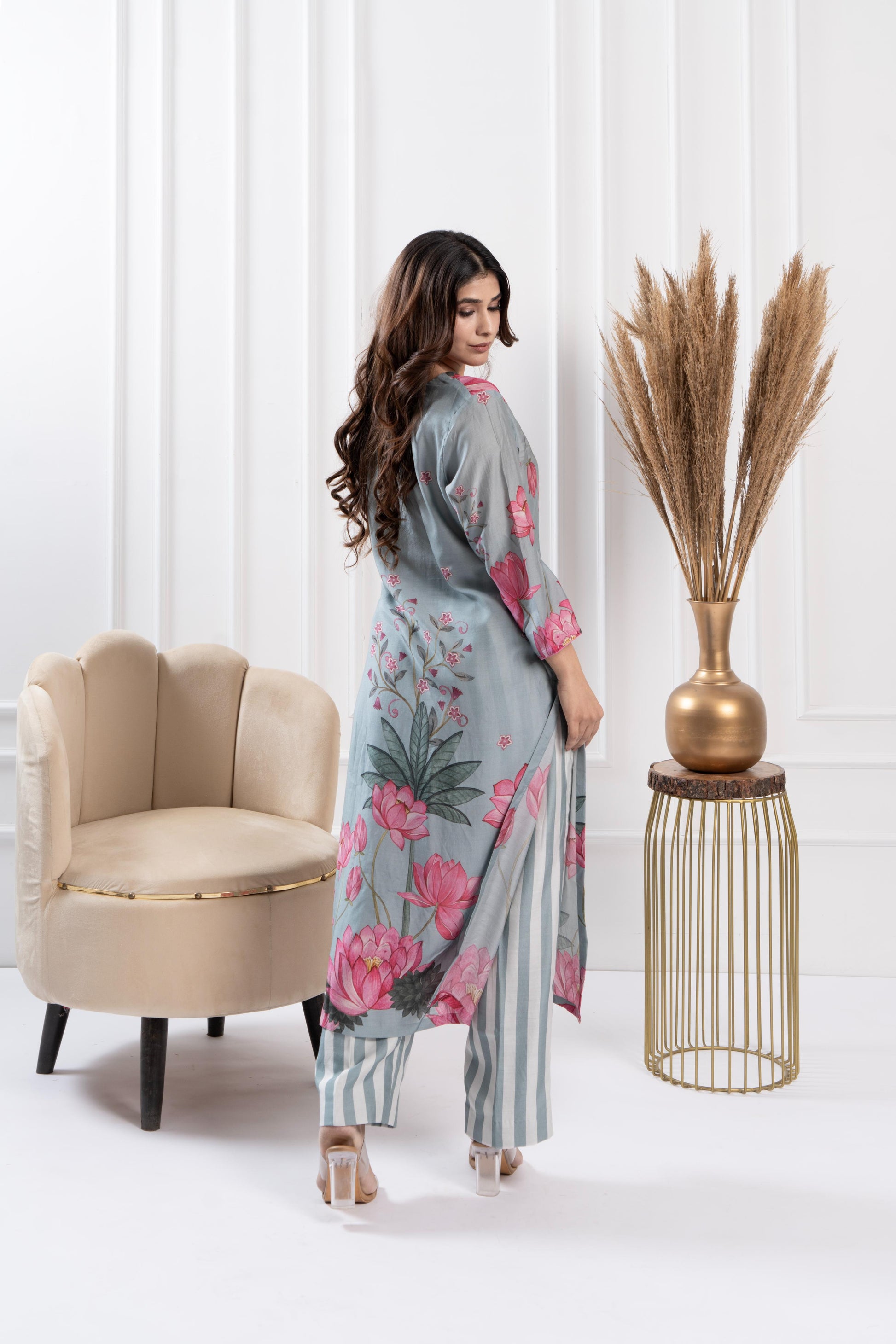Straight-cut kurta featuring an elegant placement print, paired with coordinating striped pants for a chic and contemporary look.