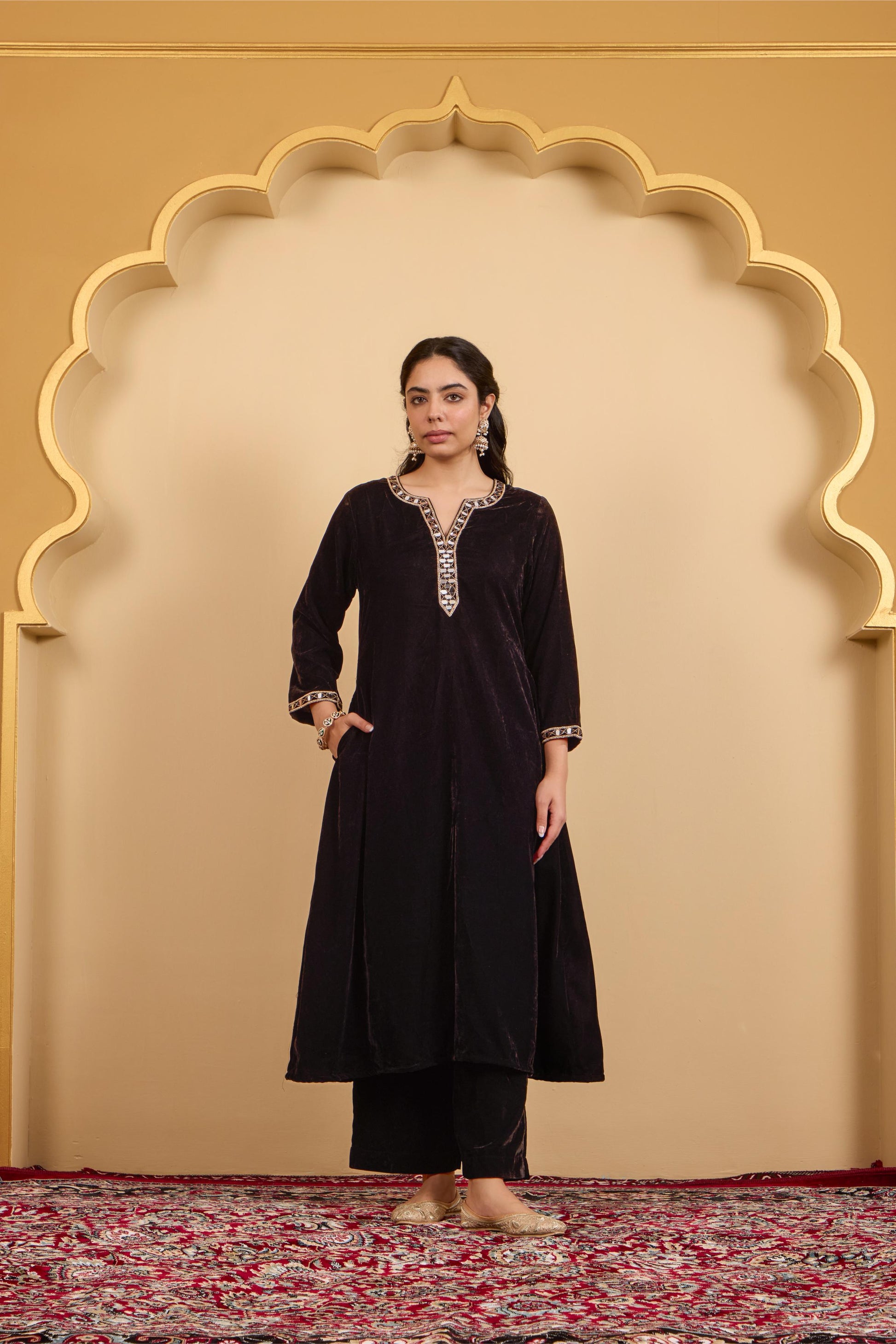 Stylish A-line velvet kurta with a flattering V-neck and intricate mirror work. Comes with straight pants and a convenient side pocket - a perfect mix of comfort and festive charm.
