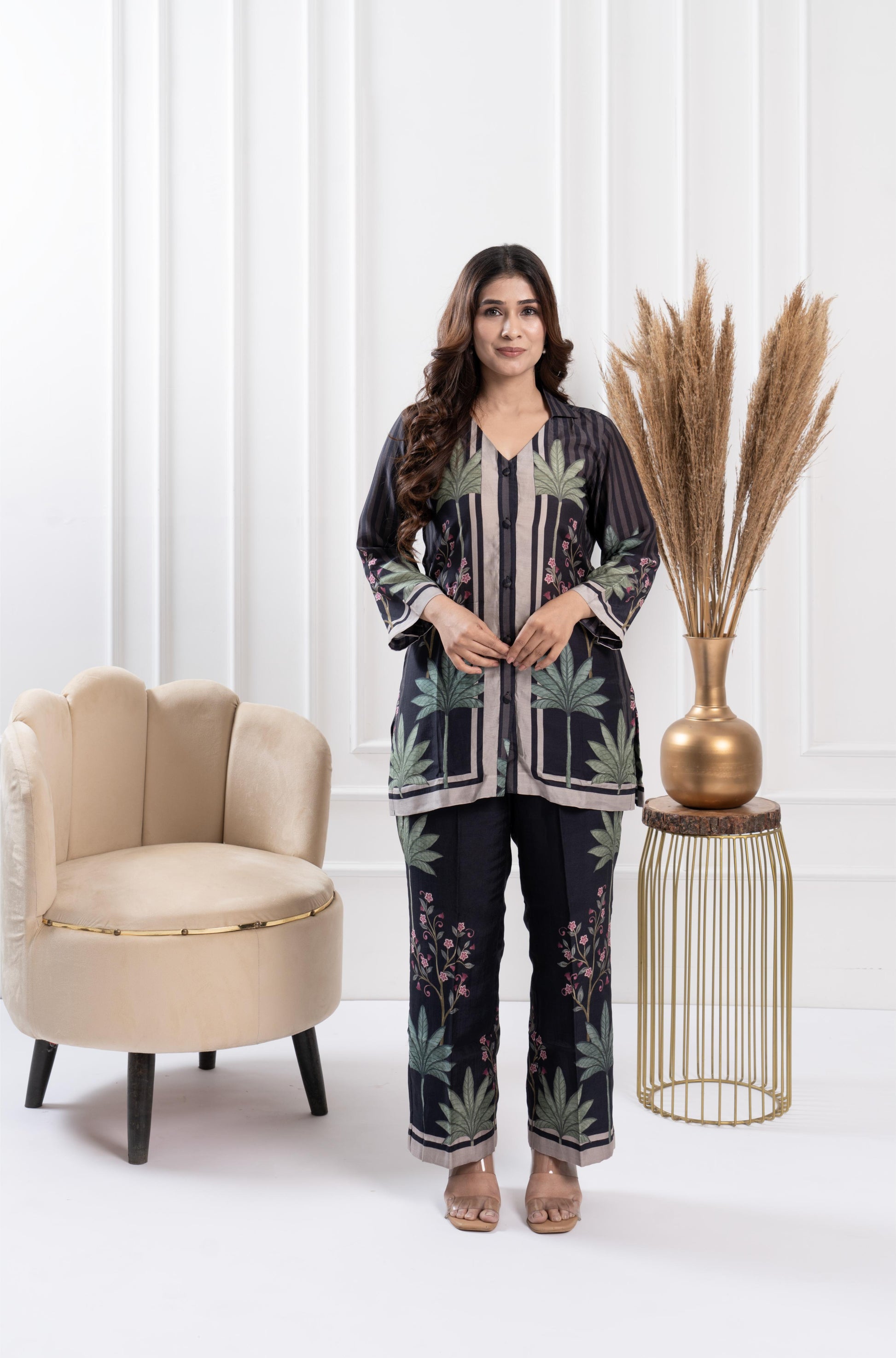 A stylish co-ord set featuring a unique placement print that adds a bold, modern touch. Perfectly designed for a chic and coordinated look, ideal for both casual and semi-casual outings.