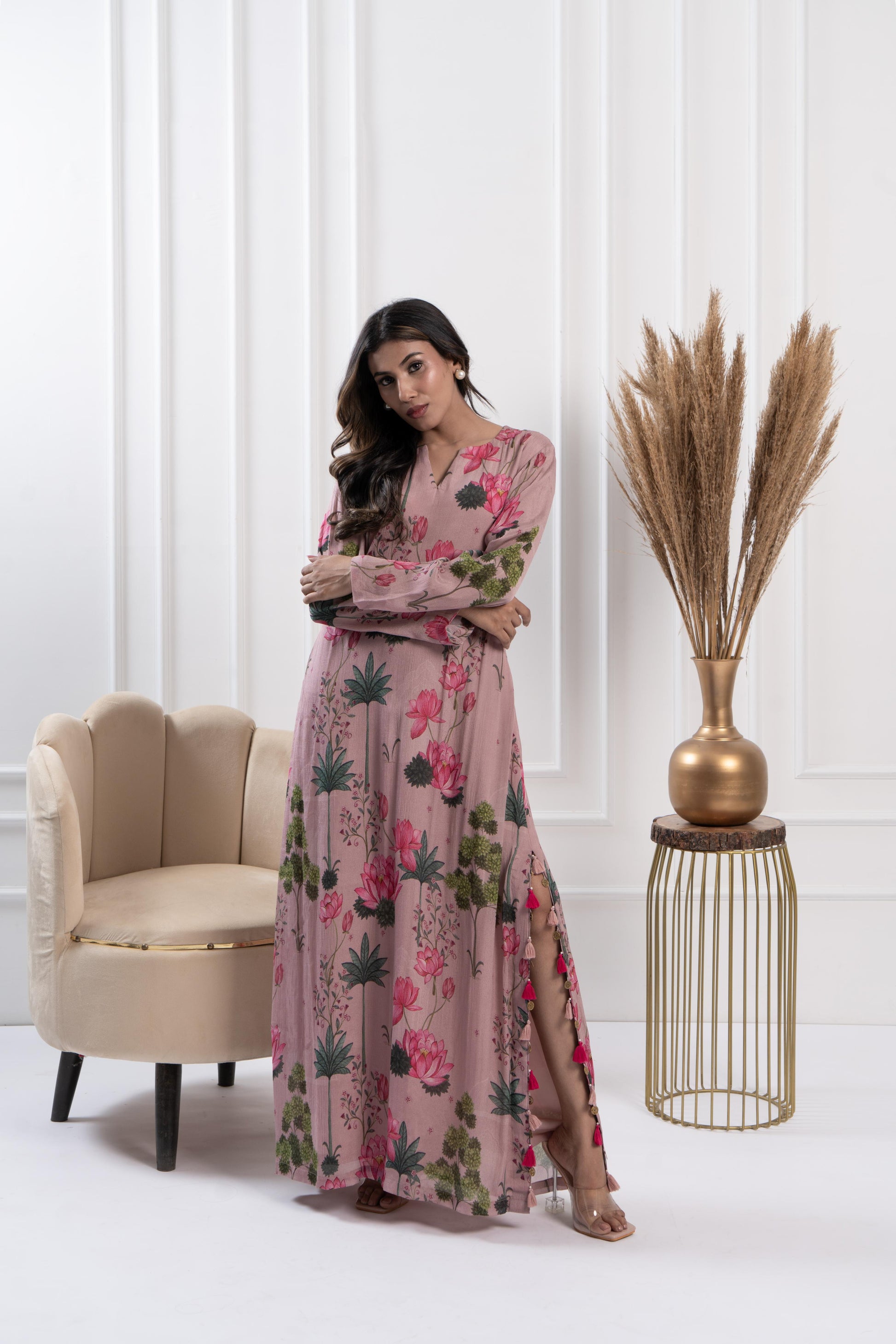 A flowy full-length kaftan featuring side slits for ease and movement, beautifully accented with intricate embroidery along the slits. Effortlessly elegant, it's a perfect blend of comfort and understated glamour.